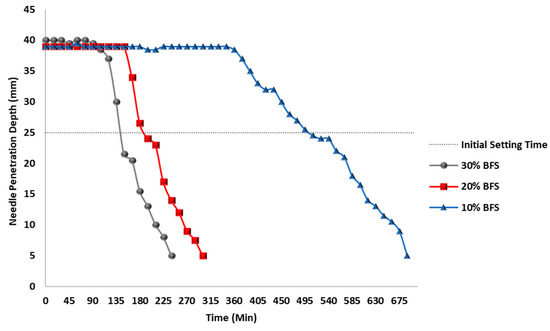 Based on the Vicat test results at ambient conditions (Figure 6), samples demonstrated a quicker initial setting with increased BFS content. This aligns with earlier observations that BFS reacts more rapidly at room temperature with reaction solutions, unlike mined zeolite, whose geopolymerization reaction takes longer [54]. This suggests that the primary product in these samples was likely a C-A-S–H gel type. The initial setting times for the samples ZS10–25 °C, ZS20–25 °C, and ZS30–25 °C were 191, 237, and 550 min, respectively. Setting time analysis was not conducted for the sample without BFS, as this test occurred at room temperature, and samples lacking BFS needed heat (at least 40 °C) to set [55]. A notable trend was observed: the setting time increased significantly when reducing BFS content from 20% to 10%, but the change was less pronounced when decreasing from 30% to 20%. The initial formation of C-A-S–H gel likely enhances BFS dissolution, creating momentum for the reaction to continue. Consequently, a higher BFS content tends to promote faster and more extensive formation of C-A-S–H, thereby reducing the initial setting time. This observation is consistent with previous research examining the setting times of mixtures containing fly ash and BFS binder [56].