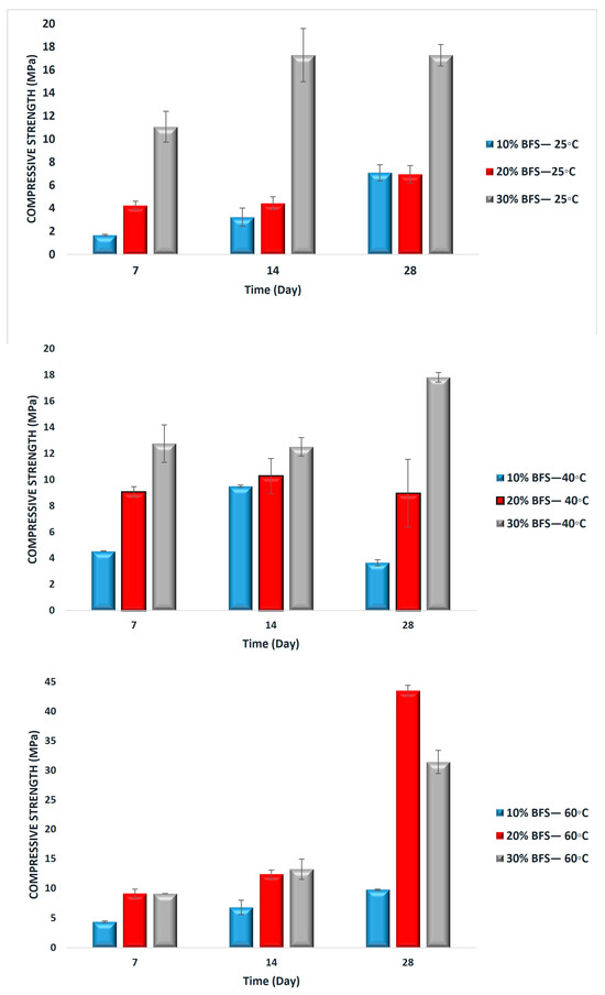 Further increasing the temperature to 60 °C does not substantially affect the early strength of most samples after 7 and 14 days. However, significant improvement in strength was observed after 28 days. ZS20–60 °C exhibited a dramatic increase in strength, reaching an average value of 43 MPa after the same period, a substantial enhancement compared to lower temperature curing conditions, while the strength of samples containing 30% BFS reached an average value of 31 MPa after 28 days.