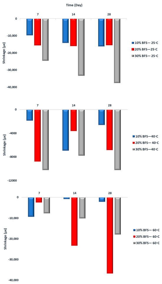 Drying shrinkage, the reduction in volume due to the loss of internal pore water, is a critical factor in cementitious materials as it can lead to cracking and adversely affect the durability of binders. Hence, understanding and managing shrinkage behavior is vital to the development of geopolymers [30]. As shown in Figure 9, the shrinkage values (measured as length change) at room temperature were found to increase with the increasing BFS content. Notably, the highest degree of shrinkage was observed in the sample with the highest amount of BFS (30%) and cured at ambient temperature. This data indicate that a balanced mix of low-calcium precursor and BFS can significantly mitigate shrinkage, performing better in this respect than other geopolymers with a higher BFS content [30].
