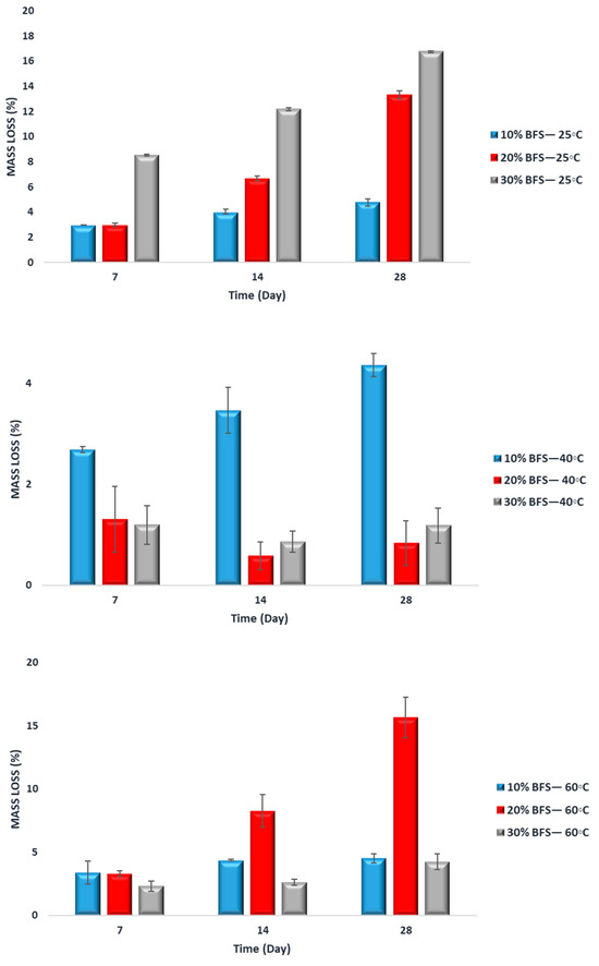 In Figure 10, we observe distinct trends in mass loss correlated with varying percentages of BFS under different treatment temperatures. At 25 °C, an increase in the percentage of BFS is directly linked to an increase in mass loss, while the mass loss data at higher temperatures (40 °C and 60 °C) do not exhibit a clear, consistent trend in relation to BFS percentages. This deviation could be attributed to several factors. Unlike the behavior at room temperature, where the reaction is predominantly driven by BFS and zeolite behaves more passively, at temperatures of 40 °C and 60 °C, zeolite waste becomes more reactive in an alkaline solution [8]. This change in reactivity alters the dynamics of the reaction. The activation of zeolite at these higher temperatures contributes to the development of new reaction products. Both BFS and zeolite contribute to the formation of different types of gels—C-A-S–H and N-A-S–(H), each possessing unique chemical structures and varying water demands [54]. The concurrent formation of these gels at elevated temperatures results in a more complicated system. This complexity is primarily due to the different water consumption patterns of these gels compared to those at lower temperatures [3]. There might be a competitive interaction between the gels for the water necessary for their formation and stability. This competition introduces an intricate balance between water consumption and retention within the geopolymer matrix, which could influence mass loss trends. Additionally, at higher temperatures, there is a greater likelihood of the formation of crystalline and nanostructures within the zeolite [64]. These structures are fundamental in affecting the water dynamics within the geopolymer, particularly their ability to influence water retention and loss through their pore size and structure [64].