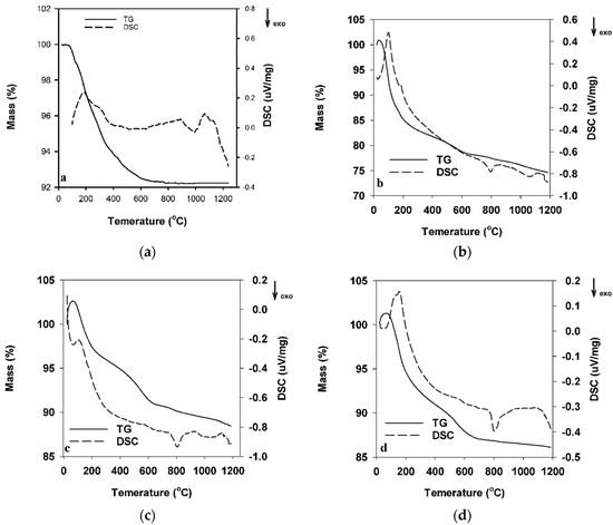 Figure 11. TG and DSC diagrams for (a) mined zeolite waste and geopolymer composites with 30% BFS cured at (b) 25 °C, (c) 40 °C, and (d) 60 °C.
