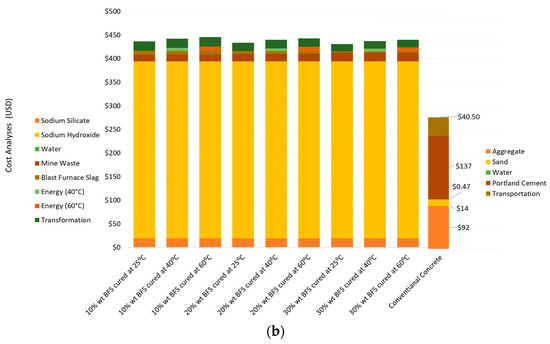 In terms of cost, geopolymer concrete, which is estimated between $430 and $445/m3, comes at a higher cost compared to conventional concrete, which has a total cost of $283/m3 (Figure 12b). This price difference is primarily because of the chemicals involved in making geopolymer concrete. Nevertheless, the higher expenses may be justified by the environmental benefits offered by geopolymer concrete. It is also important to recognize that these prices are subject to change based on geographical location and market trends.