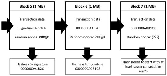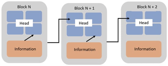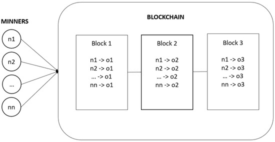 Ref. [44] defines the blockchain architecture under exceptional characteristics such as irreversibility, decentralization, persistence, and anonymity, describing the functioning and structure of blockchains in the real world and focusing on the mining process during the validation and verification of the network. View Figure 4.