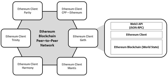 It is important to highlight that the essential component of this decentralized network is the Ethereum Virtual Machine (EVM) and its execution environment, which is deployed on the P2P network for the execution of smart contracts. At its core, the EVM is an execution engine that allows smart contracts to operate consistently and securely on the Ethereum network. The following visual representation shows how this P2P network is organized (Figure 2). In this structure, each node in the P2P network owns a complete copy of the Ethereum ledger and plays a critical role in validating and processing transactions within the platform. This distributed and decentralized design is one of the key features that makes Ethereum a unique and powerful platform in blockchain technology.