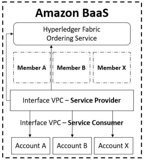 Amazon has adopted a component-based architecture to implement its blockchain network, which uses the service provided by Hyperledger and runs on the Amazon Web Services (AWS) infrastructure (Figure 9). In this configuration, the blockchain network remains operational as long as active members are deactivated only when the last member decides to leave the network. Each node owned by a user on this network owns a local copy of the blockchain ledger, which contains a record of all transactions and maintains a global network state for the specific channels in which that node participates. It should be noted that this global state is constantly updated as new transactions are made on the network.
