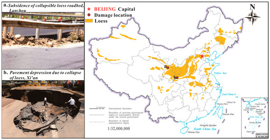 Loess is a distinctive sedimentary deposit formed during the Quaternary period, exhibiting unique internal structures and external morphological features [1,2]. This sediment is widely distributed globally, with a notable presence in central and western China (Figure 1) [3]. Despite its unique natural characteristics, when used as a building material and supporting layer, loess is susceptible to sudden drops in strength and significant increases in deformation under the influence of factors such as rainfall and irrigation [4,5]. The collapsibility of loess in the Loess Plateau poses unique challenges for the sustainable operation of infrastructure. These challenges make resource development and the continuous progress of various projects in the Loess region more difficult [6]. As the western development progresses, engineering endeavors in loess regions are bound to encounter collapsibility issues, posing significant challenges to site selection and the safe operation of constructed facilities [7]. The classification of site collapse is a fundamental engineering aspect related to collapsible loess. Due to the failure to accurately assess the type of collapse in loess sites, it is not uncommon to eliminate collapsibility in advance and cause hazards in engineering construction (Figure 1). Therefore, accurate wet collapsibility assessments aid in the planning and maintenance of more durable and environmentally friendly infrastructure, thereby promoting sustainable development in the Loess Plateau.