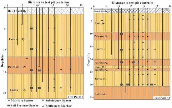 In this research, circular test pits were meticulously constructed at two specific locations, guided by the determined lower limit depth of site weight collapse derived from geotechnical engineering surveys. Test point 1 featured a test pit with a diameter of 20 m, while test point 2 boasted a larger test pit with a diameter of 30 m. Both test pits shared a uniform depth of 50 m. To account for the diverse stratigraphic conditions, present at each test point, a thoughtful arrangement of measuring points was implemented. These points included shallow and deep marking points, moisture sensors, seepage holes, and soil pressure boxes, with specific details available in Figure 4. Notably, test point 2 was configured with six evenly distributed seepage holes, strategically positioned 7 m from the center of the test pit, facilitating controlled water infiltration. The seepage holes are drilled using a drilling machine, and the holes are filled with medium-coarse sand to promote water infiltration. Conversely, test point 1 did not incorporate any seepage holes.