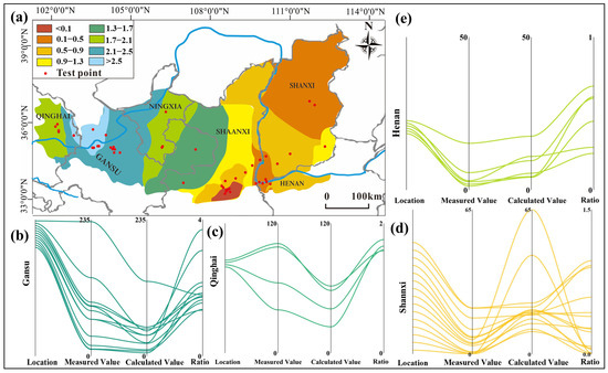 Statistics of the measured and calculated collapsible volumes in different regions of the Loess Plateau. (a) Measured β0 distribution map in the Loess Plateau area. (b–e) Respectively the measured values, calculated values and ratios of self-weight collapse in Gansu, Qinghai, Shaanxi and Henan.