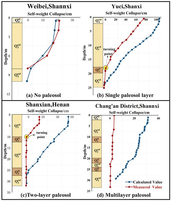 This study investigated the influence of paleosol on the discrepancy between indoor and outdoor tests through an analysis of field test results from different strata. The occurrence of paleosol layers varied across distinct geomorphological units, leading to stratification based on the number of paleosol layers. These categories include non-paleosol, single-layer paleosol, double-layer paleosol, and multi-layer paleosol, with the self-weight collapsibility of each category calculated accordingly. Consistent patterns were observed among sites with similar strata, and representative sites were chosen for detailed examination. The outcomes are illustrated in Figure 6, where the map encompasses various regions. The collapsibility values, both calculated and measured, under the non-paleosol, single-layer paleosol, double-layer paleosol, and multi-layer paleosol layers were plotted from left to right, corresponding to the depth. The left side of the map provides a visual depiction of the stratigraphic conditions at the site. It became evident from the figure that the difference between the measured and calculated curves arose with the presence of paleosol in the stratum, and this difference gradually intensified with an increase in the number of paleosol layers. As shown in Figure 6a, it is obvious that when there was no paleosol layer in the stratum, the two curves were relatively close, and the difference was not obvious. Figure 6b reflects the site immersion test of a single-layer paleosol and the calculation of self-weight collapsibility, with the calculated collapsibility of this type being larger than that of the field test. The trends of the two curves were basically the same before the appearance of the paleosol layer, and there was an obvious inflection point on the measured curve at the top of the paleosol layer. After this point, there was almost no collapsibility in the paleosol layer and its lower strata, but there was a certain amount of collapsibility in the calculation curve. Figure 6c also shows the same trend, and the inflection point of the measured curve also appeared above the first layer of paleosol. When the first layer of paleosol appeared, there was almost no collapsibility in the lower stratum, but the calculated curve obtained by laboratory tests still had collapsibility. Figure 6d reflects the site immersion test and the calculation of self-weight collapsibility in the presence of multi-layer and thick paleosol, and the interlayer between multi-layer paleosol and loess. The calculated collapsibility of this type was larger than that measured by the field immersion test, and the measured collapsibility value of the field immersion test was close to 0, that is, non-self-weight collapsibility. In summary, these findings emphasize that the presence of paleosol layers impacted self-weight collapsibility, leading to observable differences between the measured and calculated values.