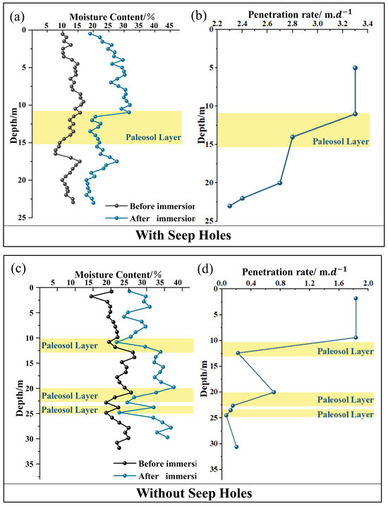Permeability coefficient and moisture content variation diagram for different depths of geological strata.(a) the change of moisture content with depth before and after immersion(without seep holes); (b) is the change of penetration rate with depth(without seep holes); (c) the change of moisture content with depth before and after immersion(with seep holes); (d) is the change of penetration rate with depth(with seep holes).
