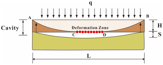 Spatial mechanical calculation model diagram of the underlying cavity zone beneath the paleosol (q—overlying soil water pressure; S—settlement of the lower part of the paleosol stratum under the load q; H—deformation height generated between the paleosol and the underlying stratum; L—hypothetical paleosol layer length).