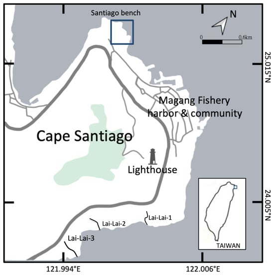 To evaluate the potential marine protected areas (MPAs), the Ocean Consecration Administration (OCA) conducted biodiversity assessments at 67 rocky shores spanning Taiwan’s main island and its surrounding islands [48]. They utilized transect line and quadrat methodologies to assess marine species richness, biomass, and a range of environmental factors, including the impacts of sewage outfalls, man-made facilities, tourist activity, siltation levels, and the abundance of rock pools. By integrating both biodiversity and environmental indicators, the OCA determined the conservation priorities of these 67 rocky shores. Among the surveyed locations were four sites at Cape Santiago, including Santiago bench, Lai-Lai-1, Lai-Lai-2, and Lai-Lai-3. Notably, the Lai-Lai-2 site, located at the southeastern edge of Cape Santiago, showcased the greatest marine species diversity. Along with the neighboring Lai-Lai-3 site, both were identified as having the highest conservation value, as reported in the OCA’s pilot survey [48].