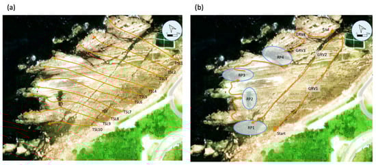 Initially, the survey protocol was adapted from the OCA’s methodology [48]. This approach involved setting up 10 transect lines on the Santiago bench within the determined survey zone. The survey groups, each comprising two members, aligned with these lines. Therefore, a total of 10 groups worked in tandem, collecting data and photographs for AI training. The primary objective was to document the time and spatial occurrence of marine species. Upon implementation, some challenges with the original proposal survey protocol (PSP) (Figure 3a) became apparent. Some species, like the sea hare, were absent during the summer surveys. Considering the route’s dual function as a prospective educational pathway, a looped configuration was determined to be more suitable than a linear design. This feedback led to the development of an adaptive survey protocol (ASP). The pivotal change in the adaptive survey protocol involved the survey route. Instead of traversing directly from the shore to the sea, the route now followed grooves (GRV) parallel to the coastline. These grooves acted as paths that led to four tidal pools (TP) and four grooves (GRV). This revised protocol offered flexibility in group sizes, and the teams could now conduct their surveys asynchronously, adhering to the predetermined route (Figure 3b).