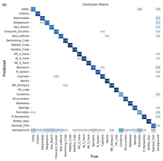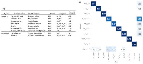 Based on the integration of the ASP and the earlier PSP, we obtained a comprehensive collection of 5461 photographs that depict 27 distinct marine species. This dataset not only showcases the spatial and temporal distribution of these species but also includes a total of 7729 annotated instances (Figure 5a). Leveraging this enriched dataset, we trained the ASP YOLOv5s model, which yielded a performance evaluation with a precision of 0.87412, recall of 0.85843, and mAP_0.5: of 0.8707. A deeper dive into the confusion matrix, post enhancement of instance and species counts, revealed that the true positive (TP) values for species like red coral algae (Corallina sp.) and tunicates were the lowest, registering at 0.56 and 0.57, respectively. Notably, most of the species TP values from the PSP remained unchanged. The earlier low TP values observed in the PSP dataset for barnacles and oysters showed slight improvements, rising from 0.83 to 0.84 and 0.87 to 0.90, respectively (Figure 5b).