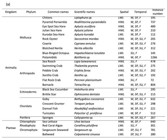 The participants in the CS project were recruited by the SDCDA and underwent a comprehensive 16 h training session. This training workshop, conducted by the authors in collaboration with marine experts, encompassed topics such as rocky shore ecology, macrobenthos species identification (Table 1), AI training procedures, survey assistance methods, and environmental education. To enhance their training, materials from a prior survey compiled from the author’s dataset [49] that identified 13 phyla and cataloged 234 marine species, including a new marine flatworm species [50], were provided, complemented by images of each species previously documented in the region. The main responsibilities assigned to the CS participants were twofold: data collection through field surveys and public education regarding the intertidal environment.