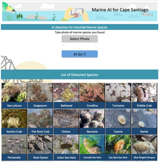 An application program interface (API) was developed using the Python programming language to facilitate a web-based interface (Figure 6). This interface hosts the trained AI model dedicated to marine specimen recognition and is stationed on a cloud server for efficient specimen identification tasks. Crafted with the intent to aid the CS participants during surveys or environmental educational endeavors, this tool proves invaluable in real-time specimen identification. On encountering marine organisms in their natural habitat, users can snap photos using their mobile devices and promptly upload them for instant AI-based identification. Upon receiving the image, the API communicates with the AI model to carry out the recognition process, subsequently relaying the results back to the user (Figure 7). This streamlined process greatly enhances the efficiency and accuracy of specimen surveys and educational activities.