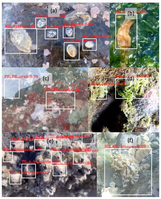Examples of AI-identified specimen instances: (a) 4 blotched-nrites, 1 cowrie, and 1 rocky oyster, (b) 1 eye spot sea hare, (c) 2 flat rock crabs, (d) 2 sea lettuce, (e) 10 barnacle shells, (f) 1 blue-ringed octopus.