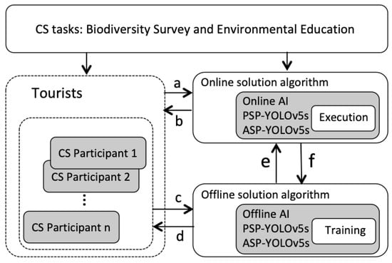 Utilizing an online AI tool, the CS participants enhance the AI’s identification capabilities through real-time data provision. This iterative process may refine the YOLOv5s model, which is our offline solution algorithm (offSA) that, after rigorous training using images from CS activities, is now operational on a server (Figure 8e). A user-friendly interface (Figure 6) has been established to streamline access to the online solution algorithm (onSA), serving both the CS participants (CSPs) and tourists engaged in educational programs (Figure 8a). The interface offers instant identification results (Figure 8b) and is integral to data collection for continuous AI training. This strategic implementation forms a dynamic feedback loop with data from queries contributing to successive training cycles, progressively enhancing the AI model’s accuracy (Figure 8a,f).