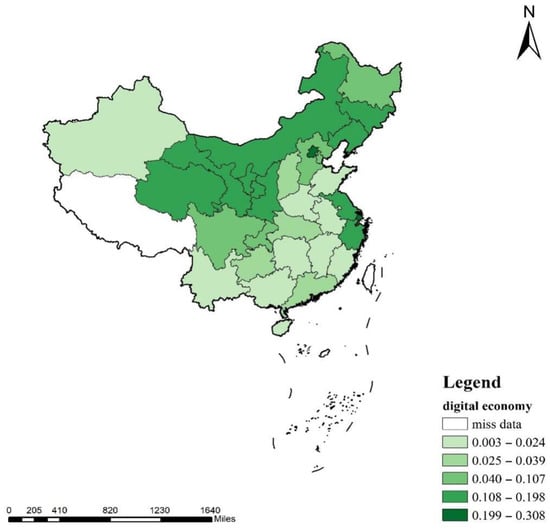 This study investigates the relationship between the Digital Economy (DE) and the GTFP in China’s mining industry. Given the absence of a unified DE evaluation criterion, the research refers to the G20 Hangzhou Summit’s definition and indicators from the Digital Economy Development Report [49]. To enhance the analysis, this study has built an inclusive evaluation system focusing on three core dimensions: digital infrastructure, digital industries, and digital applications. Key indicators include Internet and mobile phone penetration rates, employment in Internet-related sectors, and an inclusive digital finance index. The entropy method standardizes this data, which has been used to compute the digital economy for Chinese provinces from 2008 to 2021. Details can be found in Table 1, with 2021’s geographic trends showcased in Figure 3.