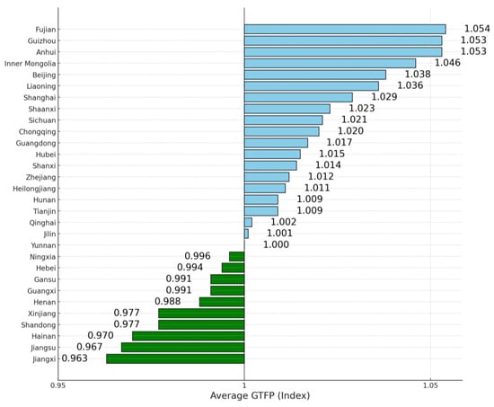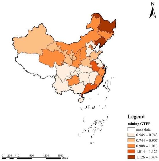 To address this issue, Hayami [52] introduced the meta-frontier concept, which better represents technological diversity by dividing DMUs into specific subgroups [53]. This approach effectively addresses the technological variances in mining due to factors such as resource quality and environmental considerations. It begins by assessing the efficiency of each group-specific frontier, followed by establishing a collective meta-frontier. The Technology Gap Ratio (TGR) is then used to measure the technological disparity between each subgroup and the meta-frontier, indicating the proximity to potential technological advancements. The GTFP in China’s mining industry for the year 2021 is depicted in Figure 4. Define the directional vector as: