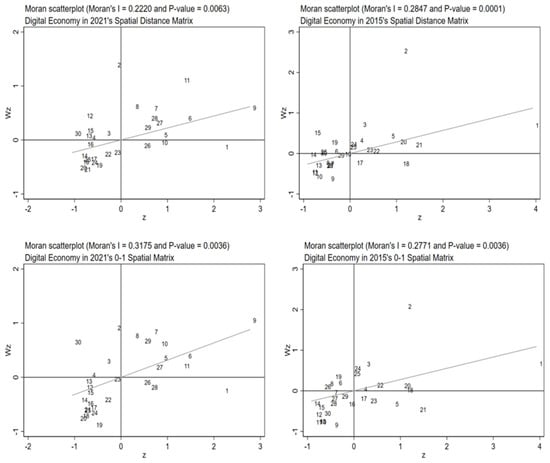 This study investigates the spatial correlation characteristics of DE. To accomplish this, we employed both adjacency weight matrices and geographic distance weight matrices to calculate Moran’s I index. The results are presented in Table 8. In many of the years examined, Moran’s I index showed positive values and was statistically significant at a 5% level or lower, irrespective of whether adjacency or geographic distance weight matrices were used. This finding strongly suggests a significant positive spatial autocorrelation among geographically adjacent regions in terms of digital economic activity. This result not only underscores the importance of geographic factors in the development of DE but also enhances the robustness of the conclusion.