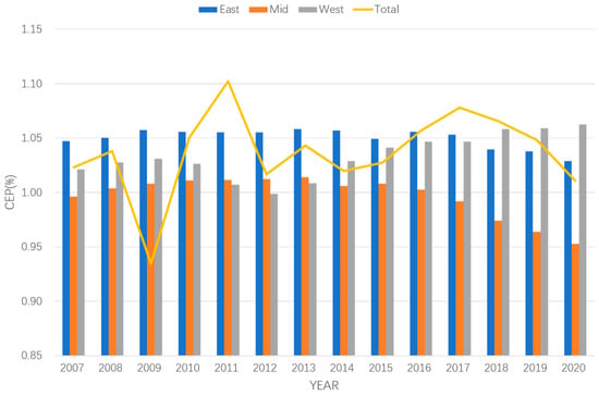 However, studies on the ECPT have paid little attention to carbon emissions, even though they are an important part of reaching carbon neutrality targets. At the moment, only a small group of academics are looking at how the ECPT affects carbon emissions. Du et al. [7] employed the DID methodology to investigate the effects of pilot policies implemented by the ECPT on carbon emission efficiency (CEE). Their findings indicated that the adoption of the ECPT had a noteworthy impact on enhancing CEE. Specifically, the introduction of the ECPT led to a 5.8% rise in the CEE of the pilot provinces. Furthermore, this effect was observed to persist for approximately three years. This work aims to delve deeper into the impact of the ECPT on the CEP, building upon the research conducted by Du et al. [7].