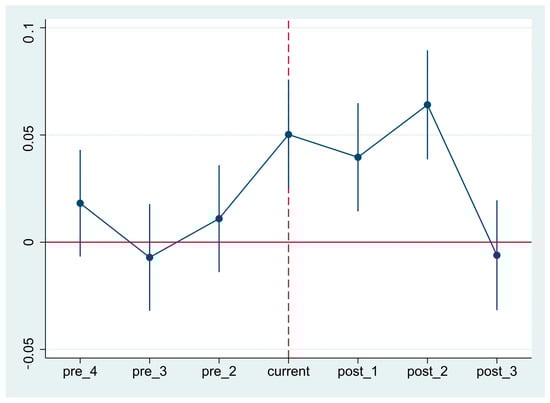 Upon conducting the analysis, the findings indicate that none of the dummy variables denoting the pre-policy occurrence exhibited statistical significance. This suggests that the alterations in the dependent variables for both the experimental group and the control group prior to the policy implementation adhered to the parallel trend. The dummy variables, namely current, post1, and post2, which signify the time after the implementation of the policy, exhibited a positive correlation with the dependent variable, reaching statistical significance at a minimum level of 5%. This suggests that the policy has had a considerable impact. Table 4 and Figure 3 show the results of the parallel trend test.