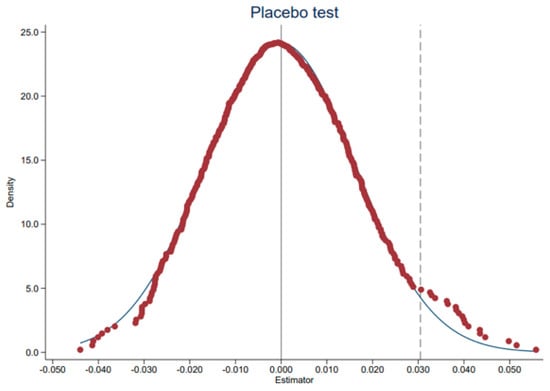 This paper used the counterfactual assumption for robustness testing, where the experimental group and control group are randomly disrupted and then the same number of groups are extracted as the new “experimental group”, with the goal of minimizing the impact of other potential variables on the relationship between the DID and the dependent variable. The same is conducted for the policy juncture, and the interaction of the false experimental group and the time dummy yielded the new DID variable. This experiment was repeated 500 times, and the resulting coefficients were plotted. The analysis revealed that the coefficient distribution largely followed a normal distribution, and the true regression coefficients fell within the low probability rejection range. These findings indicate that the placebo test was successful. Figure 4 shows the result.
