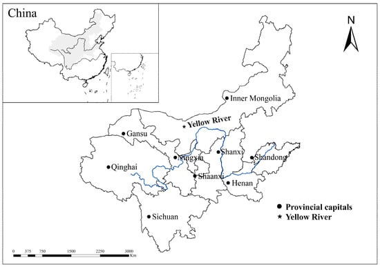 The Yellow River is the second longest river in China, with a total length of about 5464 km and a basin area of about 750,000 km2. The Yellow River originates from the Qinghai-Tibet Plateau and flows from west to east through a total of nine provinces: Qinghai, Sichuan, Gansu, Ningxia, Inner Mongolia, Shaanxi, Shanxi, Henan, and Shandong. It finally flows into the Bohai Sea [42]. As shown in Figure 1.