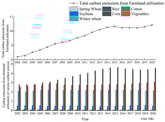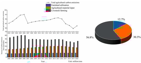 Carbon emissions from agricultural inputs (chemical fertilizer, pesticides, agricultural films, agricultural diesel, agricultural irrigation) [45] and greenhouse gases such as CH4 and N2O from agrarian soils are the primary carbon emissions. The carbon sources and coefficients are shown in Tables S1–S3. According to the IPCC’s fifth assessment report, the greenhouse effect caused by one ton of CH4 is equivalent to 6.8182 t C, while that caused by one ton of N2O is equal to 81.2727 t C [46].