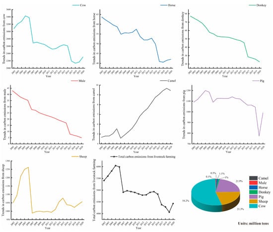 Currently, the methodologies used to measure GHG emissions from the livestock sector are mainly based on the estimation methods provided by the IPCC [47]. GHG emissions from livestock mainly originate from CH4 from animal gastrointestinal fermentation, CH4 from livestock manure disposal, and N2O. Currently, the main varieties of livestock in the YRB city group are cows, horses, donkeys, mules, camels, pigs, and sheep. The discharge coefficient of animal husbandry is shown in Table S4.