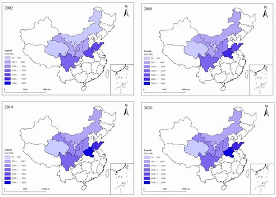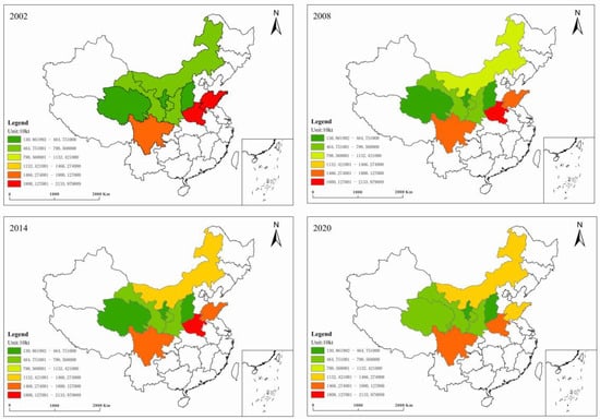 The cumulative total agricultural carbon emissions in various provinces of the YRB urban agglomeration from 2002 to 2020 are shown in Table S10 and Figure 6. According to the results, Henan Province, Sichuan Province, and Shandong Province have accumulated over 30 million tons of carbon emissions, specifically 39.791 million tons, 33.046 million tons, and 31.903 million tons, respectively. The cumulative agricultural carbon emissions in Inner Mongolia Autonomous Region, Gansu Province, and Shaanxi Province range from 100 to 220 million tons. The cumulative agricultural carbon emissions in Qinghai Province, Shanxi Province, and Ningxia Hui Autonomous Region range from 30 to 80 million tons. Agricultural carbon emissions intensity is not influenced by the total resource base and can intuitively reflect the differences in the level of low-carbon agricultural development between regions. The carbon emission intensity in the urban agglomeration of the YRB from 2002 to 2020 ranged from 0.294 to 1.76 tons per ten thousand yuan (Table S9, Figure 7). Among them, Henan Province, Sichuan Province, Shandong Province, Shaanxi Province, and Shanxi Province were below 0.4 tons per ten thousand yuan. Inner Mongolia Autonomous Region and Ningxia Hui Autonomous Region were between 0.4 and 0.6 tons per ten thousand yuan. Gansu Province and Qinghai Province were above 0.6 tons per ten thousand yuan. The average carbon emissions intensity in the YRB urban agglomeration from 2002 to 2020 was 0.59 tons per ten thousand yuan. Inner Mongolia Autonomous Region, Gansu Province, and Qinghai Province had a higher carbon emissions intensity than the basin’s average level, while the other seven provinces had a lower intensity than the basin’s average level.