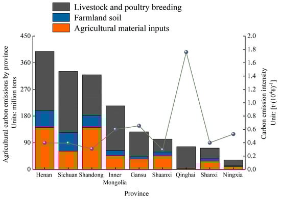 Provinces in the YRB with large areas of grain crop cultivation and relatively underdeveloped agricultural economies exhibit higher carbon emission intensity, while regions with a higher proportion of economic crop cultivation and relatively developed economies show lower agricultural carbon emission intensity. Additionally, there is an increasing trend of carbon-emission-intensity disparity among different regions, highlighting the gradually emerging levels of sustainable agricultural development.