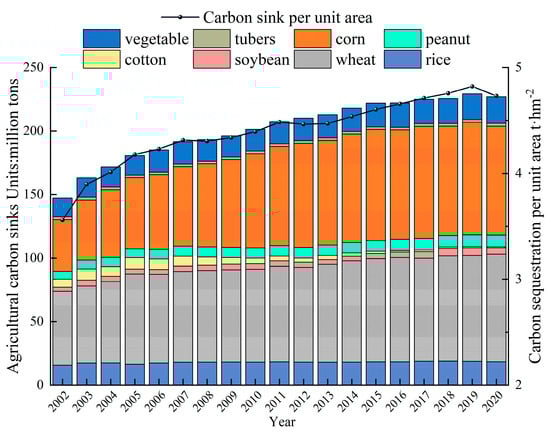 There were significant differences in carbon sequestration in the urban agglomeration of the YRB from 2002 to 2020 (Table S11, Figure 8). The high-carbon-sink areas in the southeast and southwest regions of the YRB, including Henan Province, Shandong Province, and Sichuan Province, accounted for 34.1%, 29.5%, and 14.3%, respectively, of the total carbon sequestration in the urban agglomeration of the YRB. The low-carbon-sink areas are mainly concentrated in the northwest region, including Qinghai Province, Inner Mongolia Autonomous Region, and Ningxia Hui Autonomous Region. During the period from 2002 to 2020, there was a significant increase in carbon sequestration in agriculture. Within this timeframe, the total agricultural carbon sink increased from 147.24 million tons to 226.92 million tons, with a growth rate of approximately 54.1%. The urban agglomeration of the YRB covers a vast area and has diverse climatic conditions, leading to variations in the predominant crops across different regions. In this study, crops accounting for more than 90% of the total were selected, and carbon sequestration was assessed for eight specific types of crop: rice, wheat, corn, soybean, cotton, peanuts, vegetables, and tubers. The results are shown in Figure 8. With the exception of cotton and potatoes, all carbon sequestration values for the selected crops increased. Corn and soybean showed the fastest growth, with average annual growth rates of 4.31% and 3.32%, respectively. In terms of carbon sequestration, wheat and corn are the main sources of agricultural carbon sequestration, accounting for 73% of the total carbon sequestration. Wheat and corn are the crops with the largest carbon sequestration in the urban agglomeration of the YRB, accounting for 37% and 36%, respectively. The carbon sequestration per unit has shown an increasing trend from 2002 to 2020, but slight decreases were observed in 2008, 2012, and 2020. However, the carbon emissions per unit area increased in 2008 and 2012, indicating a potentially higher level of agricultural inputs.