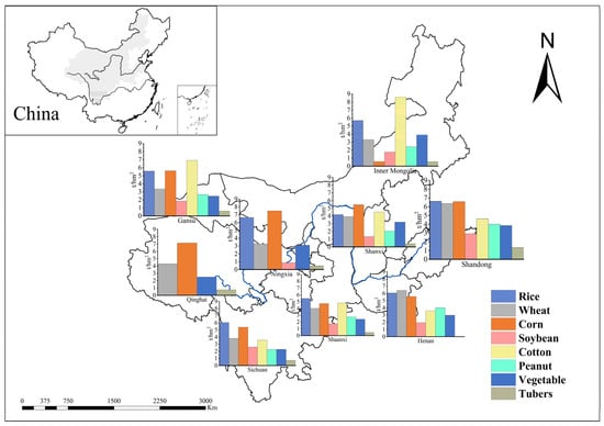 The carbon sink capacity of crops does vary in different regions (Table S12, Figure 9). In Qinghai Province, the cultivation of wheat (4.27 t/hm2) and corn (7.16 t/hm2) can better reduce carbon emissions; in Inner Mongolia, cotton (8.61 t/hm2) and rice (5.7 t/hm2) have higher crop carbon sink yields per unit of arable land, and the adjustment of the cultivation structure can help to increase the amount of carbon sinks. In Gansu Province, the carbon sink capacities of cotton (6.9 t/hm2), rice (5.58 t/hm2), and corn (5.61 t/hm2) are higher, while soybeans (1.9 t/hm2) and tubers (0.61 t/hm2) are lower. In the Ningxia region, corn (7.5 t/hm2) and rice (6.65 t/hm2) also have higher carbon sink yields, while tubers (0.47 t/hm2) and soybean (0.88 t/hm2) have lower carbon sink capacities. Sichuan Province has higher crop carbon sink yields per unit of arable land for rice (6.04 t/hm2) and corn (5.4 t/hm2). Shaanxi’s rice (5.47 t/hm2) has a high carbon sink capacity. In Henan province, rice (6.08 t/hm2), wheat (6.42 t/hm2), and corn (5.45 t/hm2) are the three crops with higher crop carbon sinks per unit of arable land, whereas tubers (0.02 t/hm2) and soybeans (1.94 t/hm2) have a lower capacity for carbon sinks. Shandong Province has a higher carbon sink for rice (6.62 t/hm2), wheat (6.37 t/hm2), and corn (6.58 t/hm2).