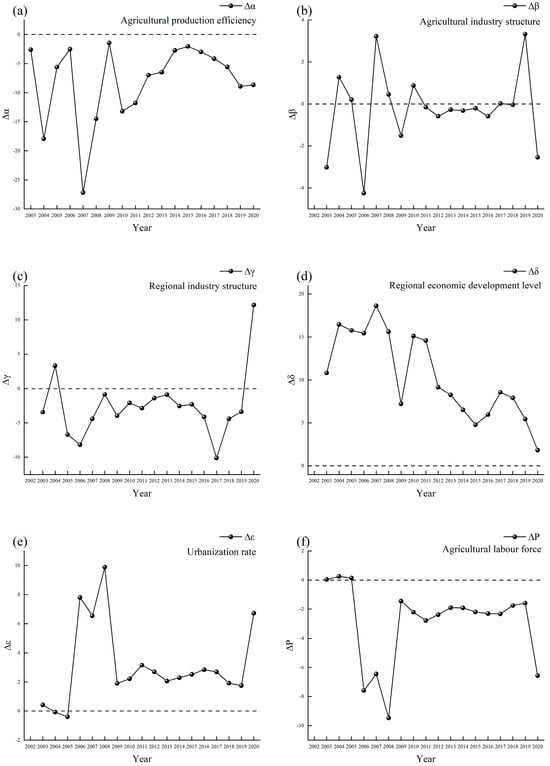 Trends in various decomposition factors in the LMDI decomposition model. (a) Agricultural production efficiency; (b) Agricultural industry structure; (c) Regional industry structure; (d) Regional economic development level; (e) Urbanization rate; (f) Agricultural labor force.