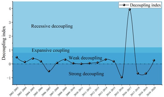 The level of agricultural economic development is one of the important influencing factors of carbon emissions in the YRB urban agglomeration. Further analysis of the decoupling relationship between carbon emissions and economic growth can assess whether economic growth is achieved at the expense of excessive carbon dioxide emissions [60]. From 2002 to 2016, the agricultural economy in the YRB urban agglomeration maintained continuous growth. The decoupling relationship between carbon emissions and economic growth can be characterized as weak decoupling and strong decoupling (Figure 12). This is attributed to the intensified implementation of sustainable development during the 12th Five-Year Plan in China, with proactive efforts in energy conservation and emission reduction across different regions. As a result, the YRB urban agglomeration achieved certain emission reduction outcomes. From 2016 to 2017, the economy of the YRB urban agglomeration experienced a decline, and the decoupling relationship exhibited a declining decoupling. Simultaneously, carbon emissions showed a downward trend during the same period. The declining decoupling indicates that carbon emissions tended to decrease along with the economic downturn. After 2018, the region exhibited a decoupling relationship that fluctuated between strong decoupling and weak decoupling. The relationship between the agricultural economy level and carbon emissions in the YRB urban agglomeration shows different patterns during different periods. This reflects the adjustment of the region’s economic growth mode and the improvement of environmental awareness. However, further measures are still needed to achieve genuine decoupling between economic growth and carbon emissions.
