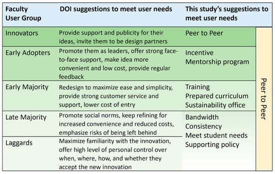 The influences on the faculty integration of sustainability into ME courses that presented themselves in this research were cross-referenced with the suggestions for different adopter categories described in diffusion of innovation theory [,], as shown in Figure 1. Aligned with DoI recommendations, the results of this study indicated that early adopters could be motivated by providing incentives like performance evaluations and/or financial bonuses for new and innovative ideas in sustainability integrations or for spreading their innovative sustainability practices to other professors, courses, or programs. Second, a mentorship program and other peer-to-peer communities could provide strong support and feedback. Early adopters may also appreciate public praise as front runners and innovators. Grant opportunities for funding to keep pushing the frontiers and taking sustainability to the next level could be of interest.