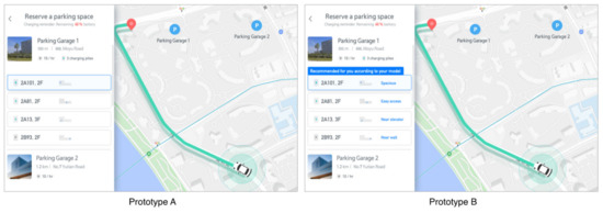 One way to deliver explanatory information for the in-vehicle display is to use visualisation with visual communication texts, images, or augmented reality in the interface [32]. For this purpose, we visualised eight scenario-based explanations in the AVP interface. For example, let us consider parking space selection touchpoints, wherein the user needs to manually select a parking space for the vehicle when approaching a destination during autonomous driving. Prototype A, on the left side of Figure 2, presents the result recommended by the system directly (without explanation), whereas Prototype B, on the right side of Figure 2, presents an explanation of the options provided:
