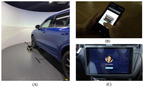 Part of the experimental process was performed in a static (non-mobile) driving simulator equipped with four car seats (two at the front and two at the back) and a 240° curved screen. The video was pre-recorded with a camera. We filmed driving scenarios on city roads. The simulation was designed to help participants better understand the state of the self-driving car. This experimental environment is shown in Figure 3. Participants entered the simulator from the side and occupied their seats within the enclosed driving space (A). The mobile application was installed on a smartphone (B) (length: 15.86 cm; width: 7.25 cm). An android pad was installed in the car as the HMI (C) (length: 20.64 cm and width: 12.52 cm).