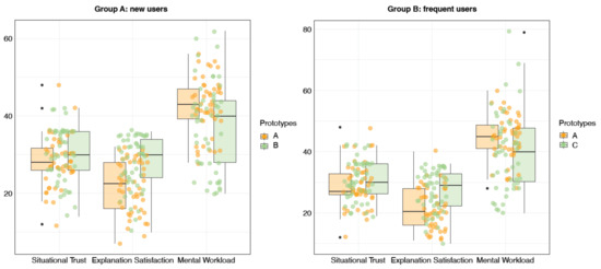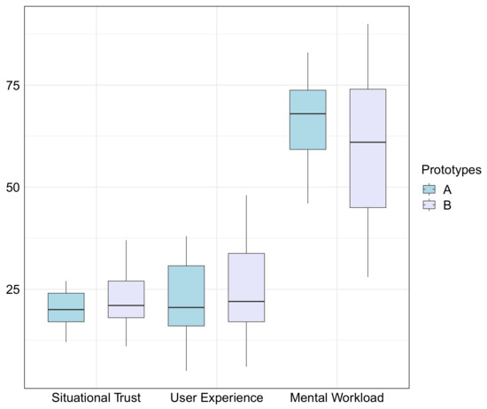 From Table 2, statistically significant differences in the scenario-based explanations were observed for the situational trust (Z = −3.421, p < 0.001), UX (Z = −2.900, p < 0.05), and mental workload (Z = 3.310, p < 0.001) of drivers. Combining the boxplot of each index shows that the scenario-based explanations led to higher situational trust, averaging 22.34 (SD = 7.46) for Prototype B and 19.26 (SD = 4.80) for Prototype A; increased UX averaged 24.62 (SD = 10.94) for Prototype B and 21.74 (SD = 9.16) for Prototype A; and lower mental workload averaged 59.42 (SD = 15.80) for Prototype B and 65.96 (SD = 9.47) for Prototype A, compared to AVs without explanations (Figure 5). Hence, H1 was partially supported.