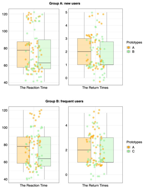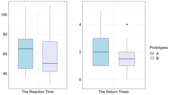 Boxplot of the reaction times (left) and return times (right) between Prototype A and B.