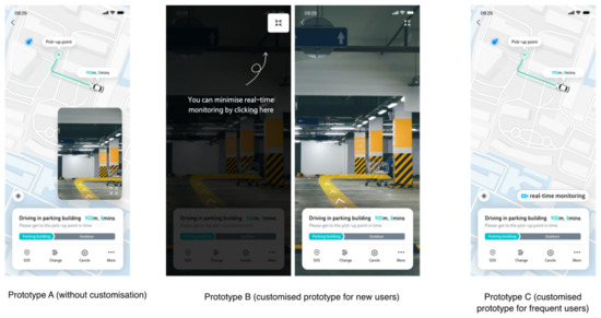 In Experiment 2, three prototypes were used for testing in the smartphone and HMI. Prototype A considered a generic interface designed without customised solutions, while Prototype B and C were customised for new and frequent users, respectively, offering different explanatory strategies (see Figure 7). The smartphone application prioritizes a map display for users to quickly track journey progress, with all prototypes showing the driving status during vehicle wait times. In the case of any abnormal issues, the system presents a safety alert.