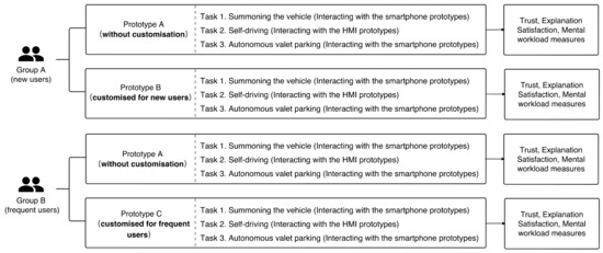 We chose a within-subjects design since we studied whether the customised prototypes would significantly improve the explainability of the AVP. Here, the independent variable was set as the customised prototypes (with/without) of the mobile applications and the HMI prototypes of the AVP system.