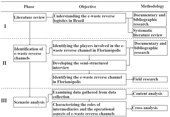 The research strategy was divided into three phases, as presented in Figure 1: (I) literature review, (II) identification of reverse channels of electrical and electronic equipment, and (III) scenario analysis.