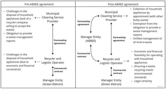 By July 2021, the manager entity ABREE and the recycler and logistic operator formalized a commercial contract, and the municipal cleaning service provider and ABREE established an agreement, reducing intermediaries and formalizing the responsibilities of each involved party in the provision of e-waste management services. In this new scenario, there was an improvement in e-waste management, as illustrated in Figure 3.