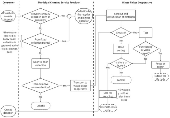 In the case of e-waste mixed with household waste, the reverse path includes at least one additional actor, which is the waste picker cooperative (see Figure 4), as the recyclable waste collected by the municipality is donated to these associations. In the interview with a waste picker cooperative, we are informed that small electronic waste is usually mixed with recyclables.
