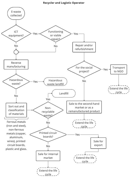 Figure 5 also shows that the recycler and logistic operator performs e-waste valorization processes, most of them for recycling purposes, while in the case of information technology, equipment for repair and reconditioning. These processes are decentralized, requiring a network of partner recycling companies [1]. The recycler and logistic operator collect the e-waste from the municipal cleaning service provider, whose annual quantity is specified in Table 3. They disassemble, sort out, and classify the materials, subsequently selling them to recycling companies, which carry out physicochemical processes. Quantitative data for material flow analysis post-collection by the recycler and logistics operator were not attainable.
