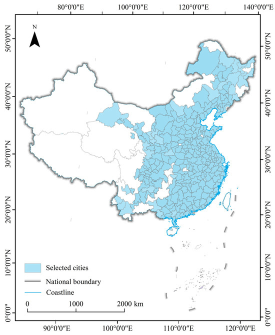 Over the past decade, China has experienced urban growth and urban shrinkage, facing the double pressure of economic development and carbon reduction [43]. Such a situation in Chinese cities provides an excellent experimental subject for the patterns of CO2 emissions in growing and shrinking cities. Considering the availability of statistical data, 285 cities (including 4 municipalities: Beijing, Tianjing, Shanghai, and Chongqing) were selected as experimental objects with reference to the definition of prefecture-level cities by Long et al. [44] (Figure 1). With a combined population of 1.21 billion, these cities make up around 93% of mainland China’s total population, according to the 2020 National Population Census. The selected cities are widely distributed and provided varied urban growth or urban shrinkage between 2005 and 2020, providing an ample perspective for exploring the patterns of CO2 emission reduction under the contexts of urban growth and shrinkage.