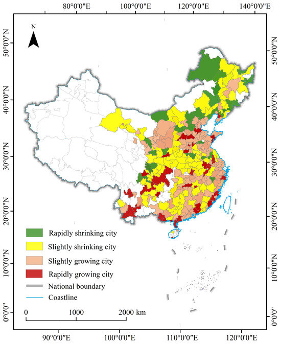Considering the studies about group divisions on growing and shrinking cities [42,50,51], according to changes in comprehensive indicators, Chinese cities were divided into four categories: rapidly shrinking cities (RSCs), slightly shrinking cities (SSCs), rapidly growing cities (RGCs), and sightly growing cities (SGCs) (Table 2).